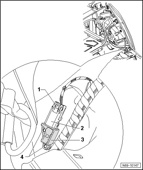 - Press connector lock - 1 - and disconnect connector - 2 - from Rear Side Airbag Crash Sensor (driver side) (G256) - 3 -.