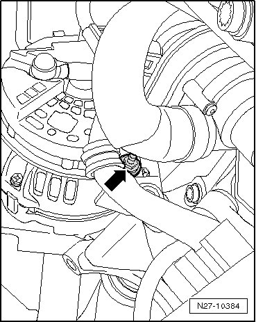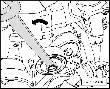 - Release tension on ribbed belt by swinging tensioning element using a 16 mm open-end wrench in direction of - arrow -.