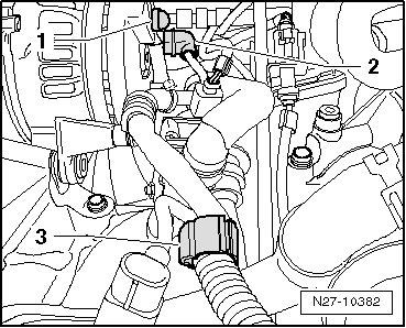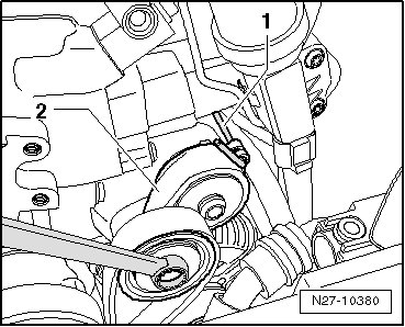 - Remove mounting bolt - 1 - of tensioning roller - 2 - and remove tensioning roller.