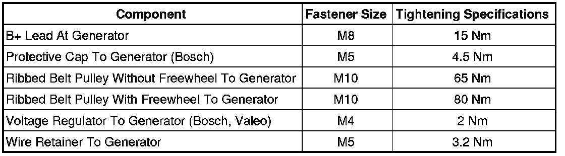 Fastener Tightening Specifications, Generator, All Vehicles