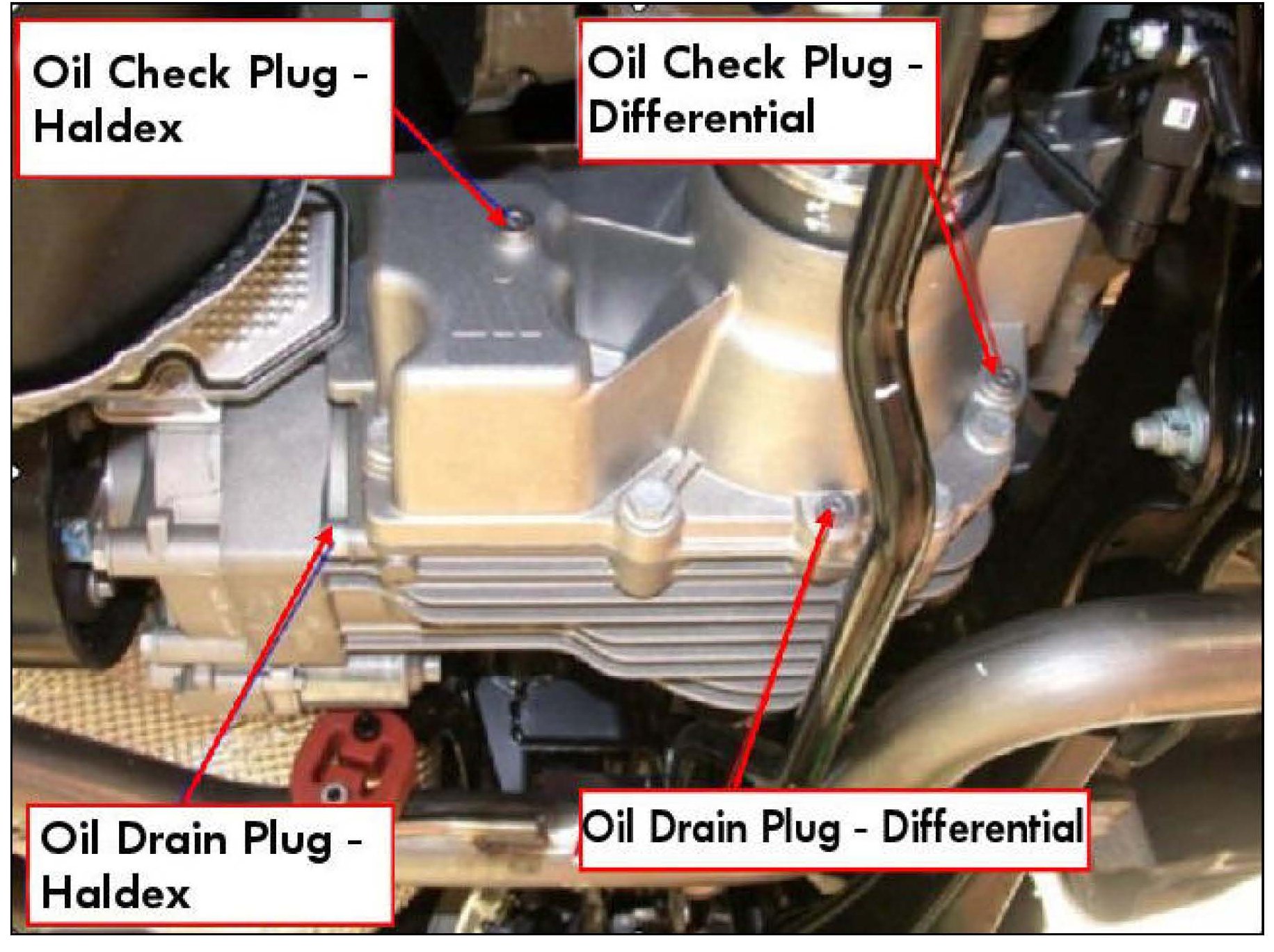 Haldex clutch and Rear Differential are a single integrated assembly with separate lubricating (oil) systems. It is possible for the oil drain plugs and oil check plugs of the two systems to be mixed up. This may lead to avoidable maintenance mistakes, which can cause failure of the Haldex clutch and/or Rear Differential.