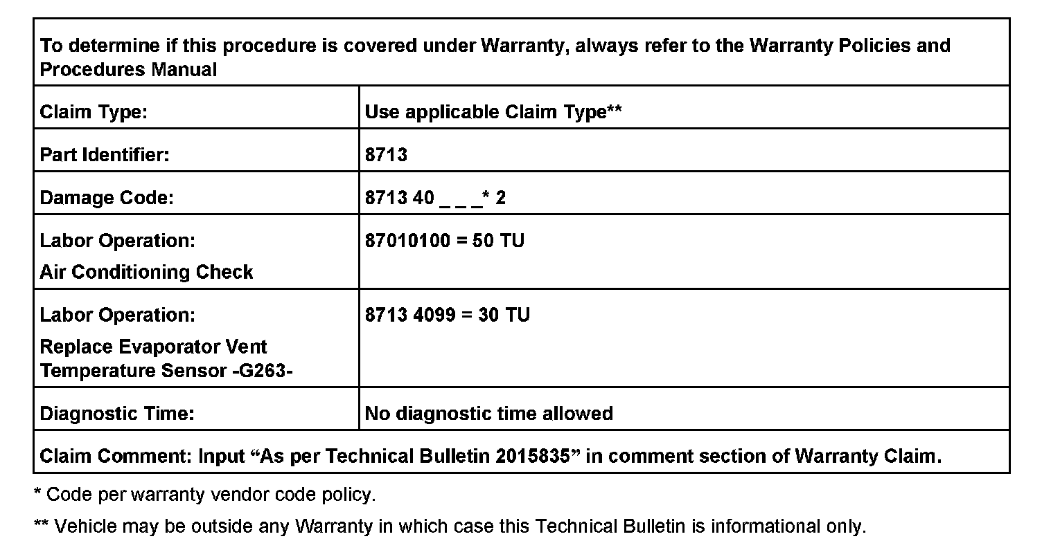 The Evaporator Vent Temperature Sensor -G263- does not measure evaporator temperature in the air conditioning unit; as a result, the evaporator freezes over and air flow drops. The result is reduced cooling performance.
