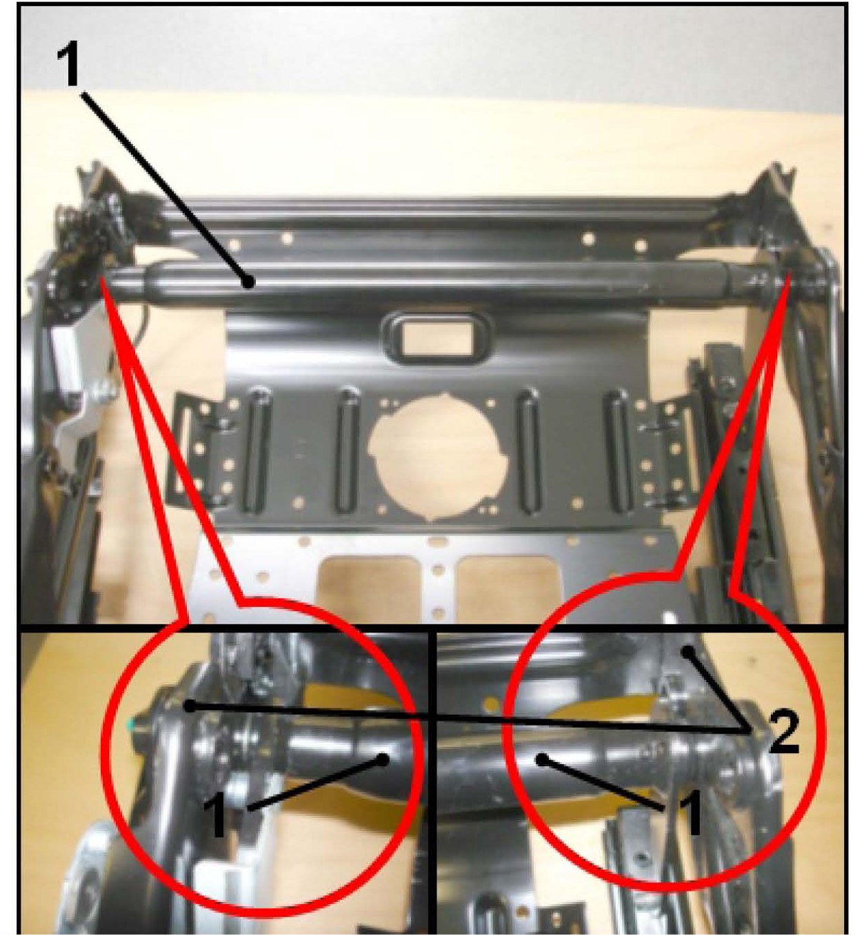 Insufficient lubricant applied between the rear cross pipe -1- and the two side rails -2- of the seat frame.
