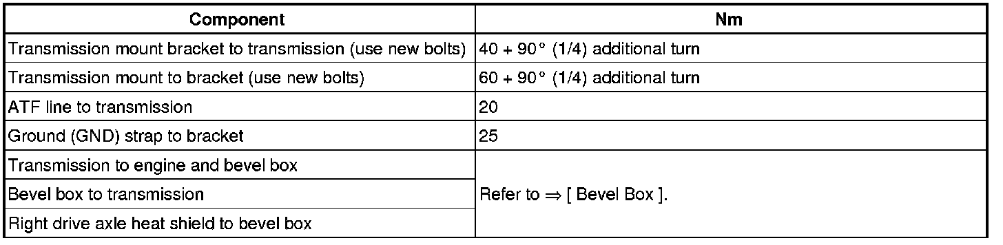 - Check the ATF level after installing. Refer to => [ Automatic Transmission Fluid Level, Checking and Filling ] Automatic Transmission Fluid Level, Checking and Filling.