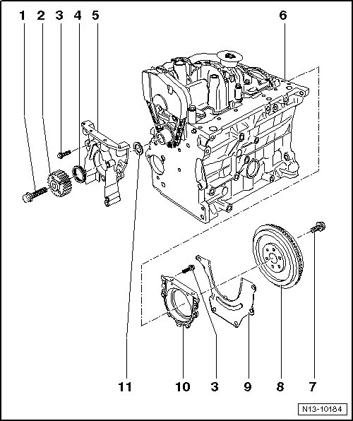 • Removing and installing, refer to => [ Sealing Flange, Drive Plate/Flywheel Side ] Sealing Flange, Drive Plate/Flywheel Side.
