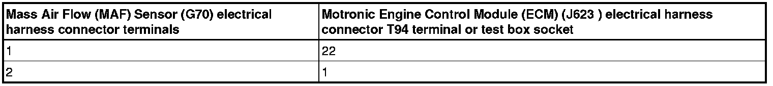 - Using a multimeter, check the Mass Air Flow (MAF) Sensor (G70) electrical harness connector terminal 1 to the Motronic Engine Control Module (ECM) (J623) electrical harness connector T94 terminal 22 for an open circuit.