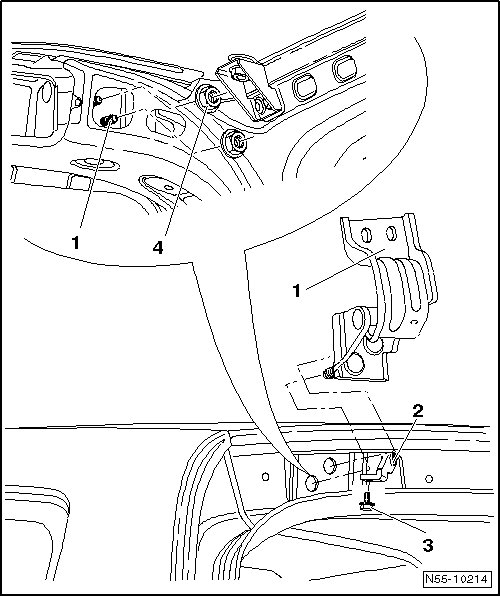 - Screw hex nut - 4 - in vehicle interior downward from hinge threaded screws - 1 - and remove hinge - 1 - from outside.