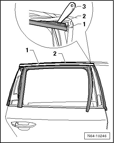 - Press trim molding - 1 - by hand evenly - arrow - into window guide - 2 -.