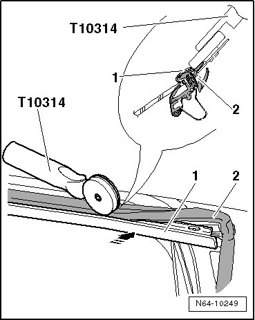 - Then press window guide correctly into trim molding mount with (T 10314).