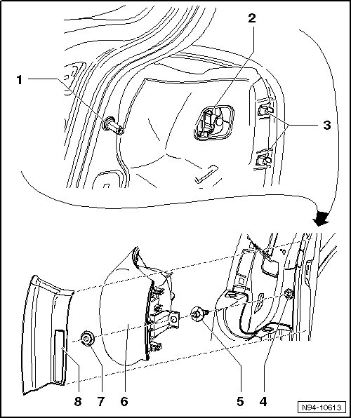 • Tightening specification, refer to => [ Fastener Tightening Specifications, Tail Lamp Assembly In Side Panel ] Fastener Tightening Specifications, Tail Lamp Assembly In Side Panel.