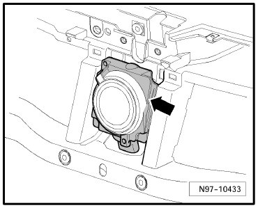Behind front grill, center -Arrow-
