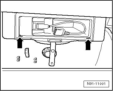 - Insert the radio unlock tool (T10057) into the provided openings - arrows - until it locks into place.