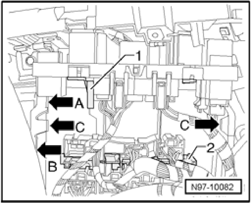- Clip Vehicle Electrical System Control Module J519 and relay carrier at vehicle electrical system control module, at left instrument panel, out of locking devices -arrows C-.