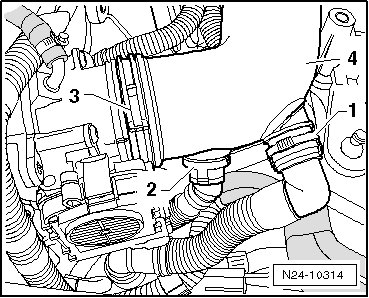 - Remove the intake tube - 4 - between the throttle valve control module (J338) and air filter. To do so, disconnect hose - 1 -, if present, and hose - 2 - (compress securing ring) and remove spring clamp - 3 -.