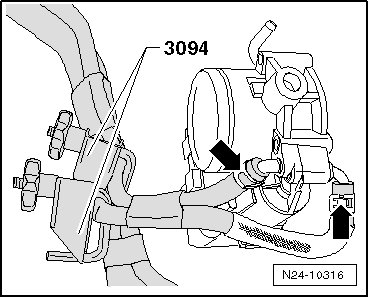 - Clamp off the coolant hoses with (3094) and disconnect them from the throttle valve connection - arrows -.