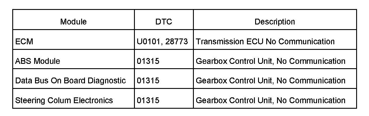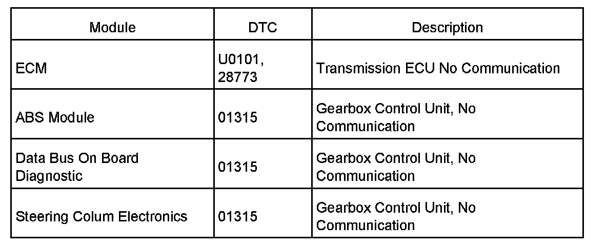 Symptom may be accompanied by No Communication from Transmission Control Module (TCM) DTCs from table.