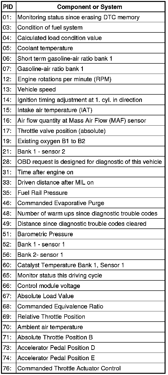 - From the following table, select the desired the "PID" that is to be monitored, e.g. "PID 05 Coolant temperature".