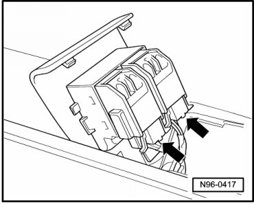 - Pull installation frame of Fuel Filler/Rear Lid Remote Unlocking Button (E463) in - direction of arrow - and remove it.