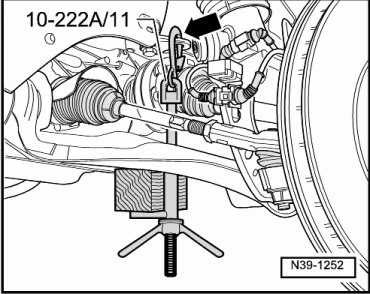 - Hook spindles (10 - 222 A /11) in eyelets - arrow - of engine carrier on left and right vehicle sides.