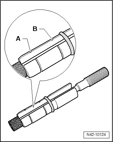 - At these two points, thread in locating pins (T10300) up to marking - B - on the locating pins by hand.
