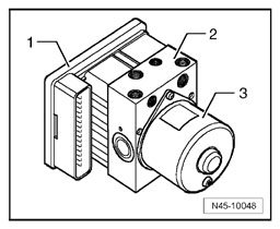 Control module - 1 - and hydraulic unit - 2 - comprise a single unit. Separation can only be performed when removed from vehicle. The hydraulic pump - 3 - must not be separated from the hydraulic unit.