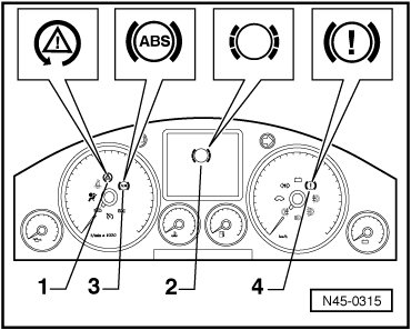 If ABS warning lamp (K47) - 3 -, ASR/ESP control lamp (K155), - 1 - and brake system warning lamp (K118) - 4 - do not go out, malfunction causes may be: