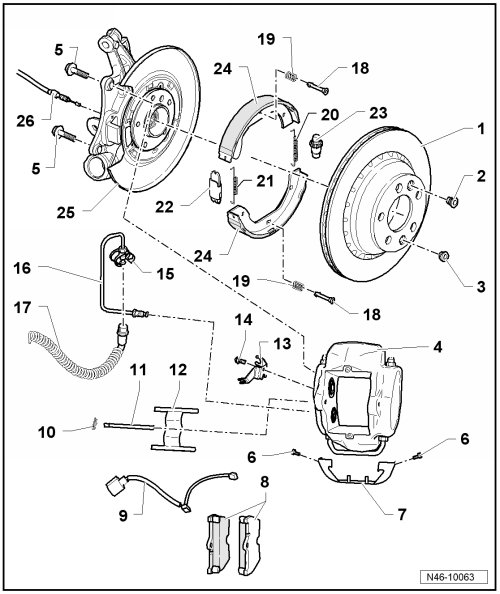 • Before removing brake caliper or disconnecting brake line, brake pedal actuator (VAG 1869/2) must be inserted (this dissipates pressure).