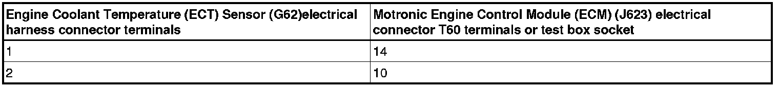 - Using a multimeter, check the Engine Coolant Temperature (ECT) Sensor (G62) terminals 1 to 2 for resistance.