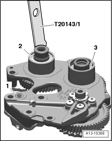 - Remove compression spring - 2 - between spur gear unit - 1 - and oil pump input shaft - 3 -.