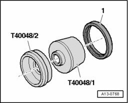 - Place pull sleeve T40048/2 on crankshaft and slide seal - 1 - into sealing surface on engine.