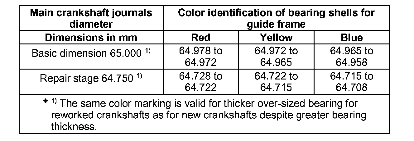 - Allocate bearing shells to determined diameter of main crankshaft journals according to the following table.
