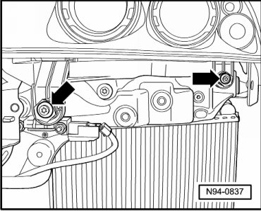 - Loosen the two front mounting bolts - arrows - far enough until headlamp mount with headlamp can be moved back and forth lightly in adjustment bushings.