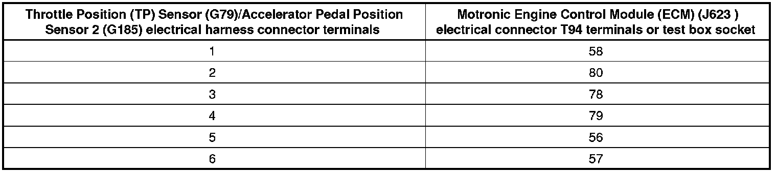 - Using a Multimeter, check the Throttle Position (TP) Sensor (G79)/Accelerator Pedal Position Sensor 2 (G185) 6-pin electrical harness connector terminals to the Motronic Engine Control Module (ECM) (J623) electrical connector T94 for an open circuit according to wiring diagram.