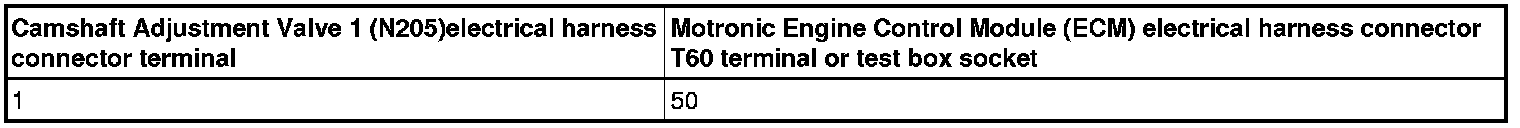 - Using a Multimeter, Check the Camshaft Adjustment Valve 1 (N205) or Camshaft Adjustment Valve 1 (exhaust) (N318) electrical harness connector terminal 2 to the Motronic Engine Control Module (ECM) electrical harness connector for an open circuit.