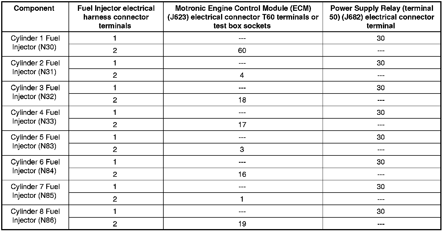 - Using a Multimeter, check the Fuel Injector electrical harness connector terminals to the Motronic Engine Control Module (ECM) (J623) electrical harness connector T60 terminals for an open circuit.