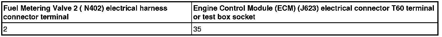 - Using a multimeter, check the Fuel Metering Valve 2 (N402) electrical harness connector terminal 2 to the Engine Control Module (ECM) (J623) electrical harness connector T60 terminal 35 for an open circuit.