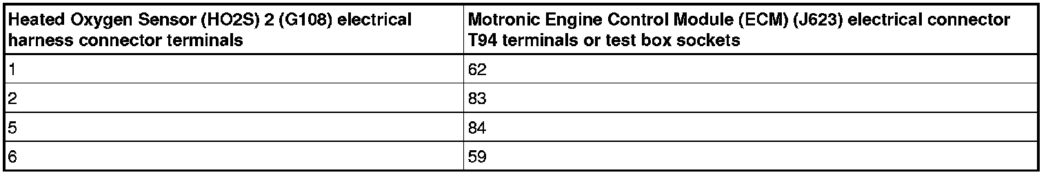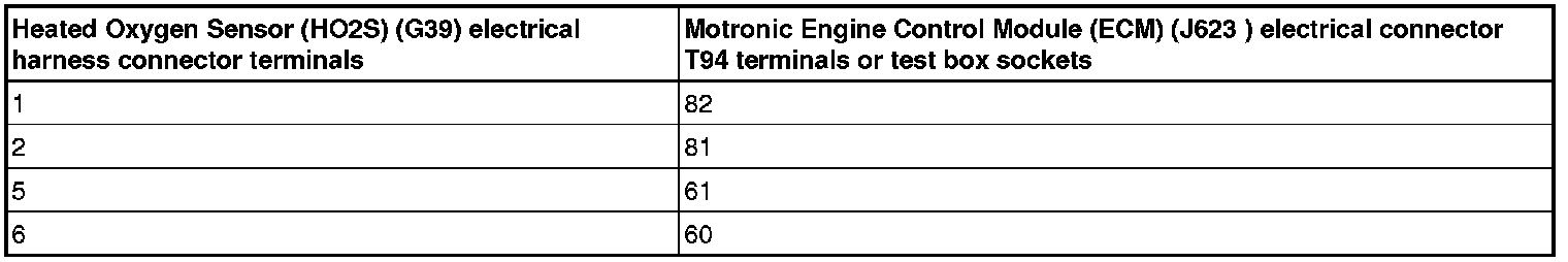 - Using a Multimeter, check the Heated Oxygen Sensor (HO2S) (G39) or the Heated Oxygen Sensor (HO2S) 2 (G108) electrical harness connector terminals to the Motronic Engine Control Module (ECM) (J623) electrical harness connector T121 terminals for an open circuit.