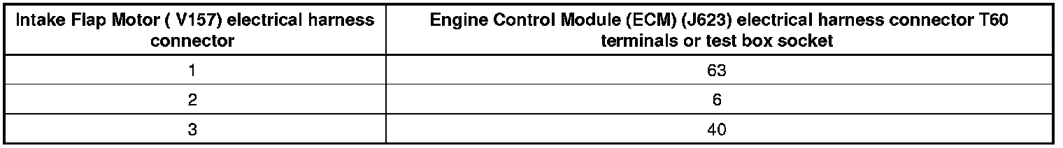 - Using a multimeter, check the Intake Flap Motor (V157) electrical harness connector terminal 2 to the Engine Control Module (ECM) (J623) electrical harness connector T60 terminal 6 for an open circuit.
