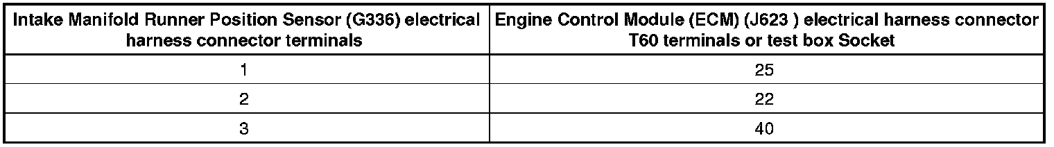 - Using a multimeter, check the Intake Manifold Runner Position Sensor (G336) electrical harness connector terminals to the Engine Control Module (ECM) (J623) electrical harness connector T60 terminals for an open circuit.