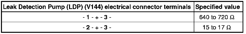 - Using a Multimeter, check the Leak Detection Pump (LDP) (V144) for resistance as follows: