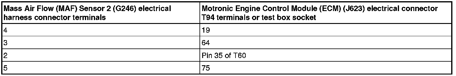 - Using a multimeter, check the Mass Air Flow (MAF) Sensor 2 (G246) electrical harness connector terminals to the Motronic Engine Control Module (ECM) (J623) electrical harness connector T94 terminals for an open circuit.