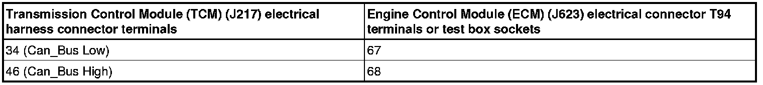- Using a Multimeter, check theTransmission Control Module (TCM) (J217) electrical harness connector to the Engine Control Module (ECM) (J623) electrical harness connector T94 for resistance.