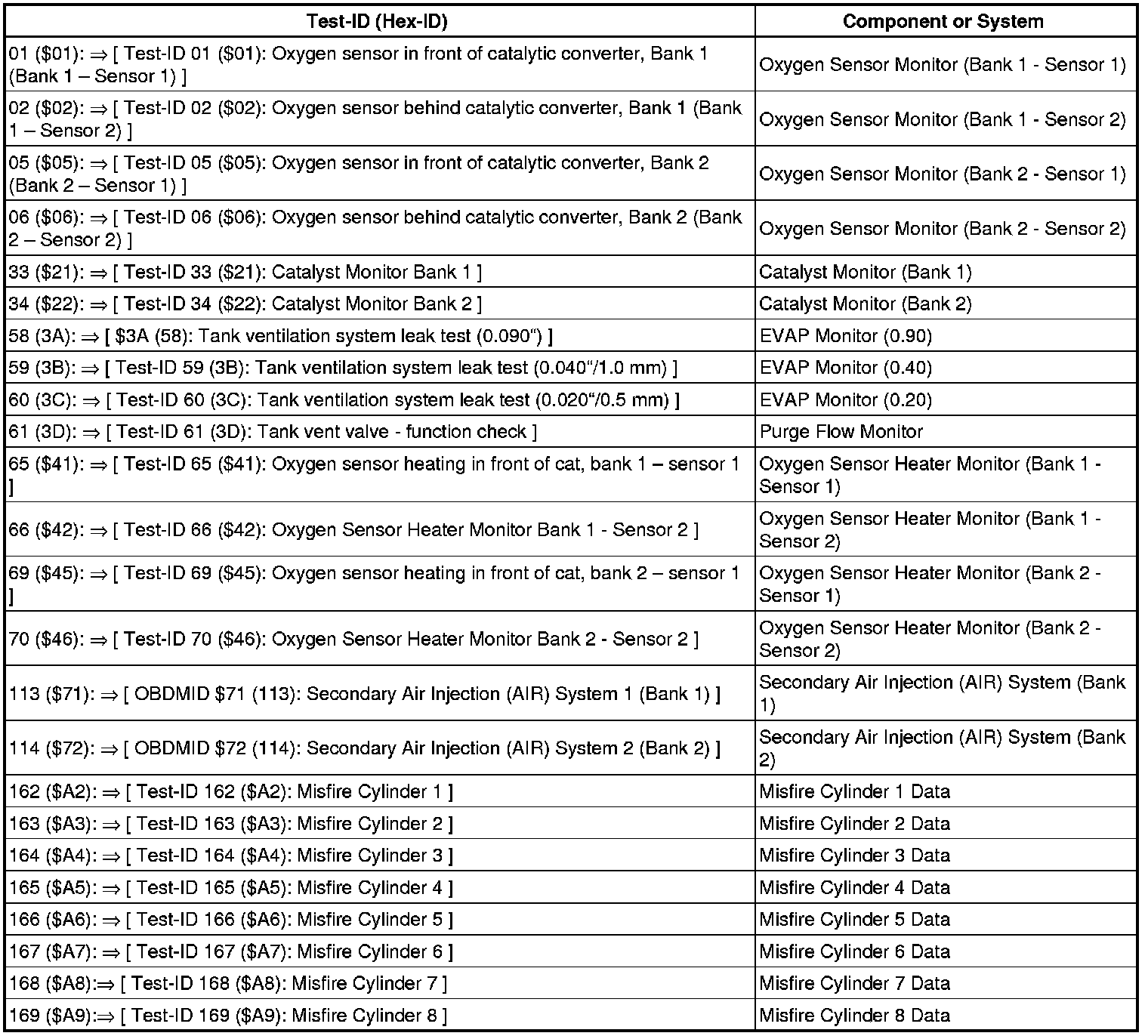 Depending on the scan tool and protocol used, the information displayed in Diagnostic Mode 06 may be referred to by different names such as Test-ID (TID), Hex-ID, Component-ID (CID), On-Board Diagnostic Monitor Identifier (OBDMID), or contain no name at all and may be referenced by only a number.