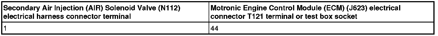 - Using a multimeter, check the Secondary Air Injection (AIR) Solenoid Valve (N112) electrical harness connector terminal 1 to the Motronic Engine Control Module (ECM) (J623) electrical harness connector T121 terminal 44 for an open circuit.