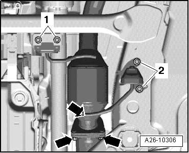 - Remove right main catalytic converter bracket bolts - 1 - and - 2 -.