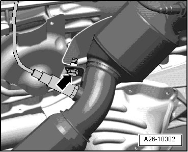 - Remove bolts - arrow - at right primary catalytic converter bracket.