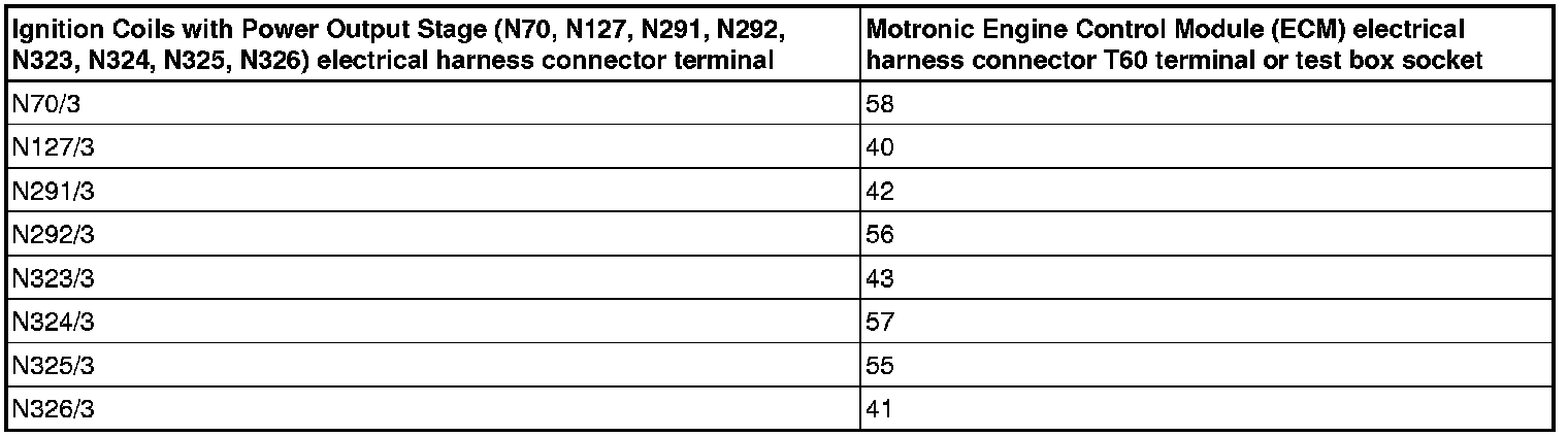 - Using a Multimeter, Check the Ignition Coil electrical harness connector to the Motronic Engine Control Module (ECM) (J623) electrical harness connector T60 for an open circuit.