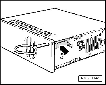 - Insert Radio Removal Tools (T10057) into release openings - arrows - until they engage.