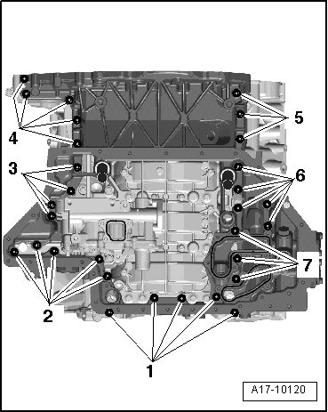 - Tighten the bolts - 1 through 7 - diagonally in sequence to 5 Nm.