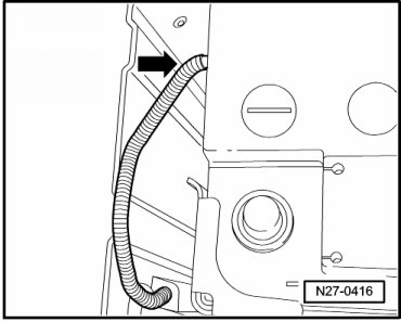 Ensure central breather hose is attached to battery - arrow -, and hose is not pinched during installation. Only then can battery be properly vented.
